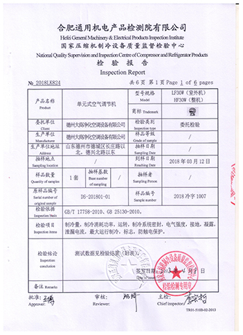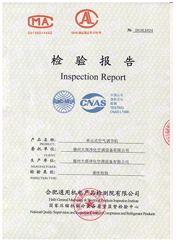 2018年3月,德州大商凈化空調設備有限公司所生產的單元式空氣調節機獲得認證檢驗中心——合肥通用機電產品檢測院有限公司(壓縮機制冷設備質量監督檢驗中心)出具的檢驗報告。